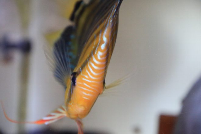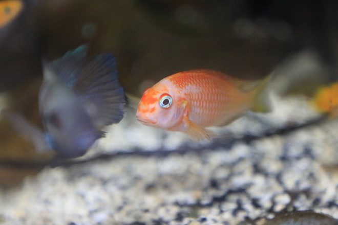 まずは一番大きい水槽。子育てが終わって養生中の親魚が10数匹。そして成長しきれなかった成魚も数匹。一番大きいサイズで16㎝はあります。なので、900の水槽でもいっぱいいっぱい。体調の変化など、ここにいる魚たちでコンディションはほぼわかります。