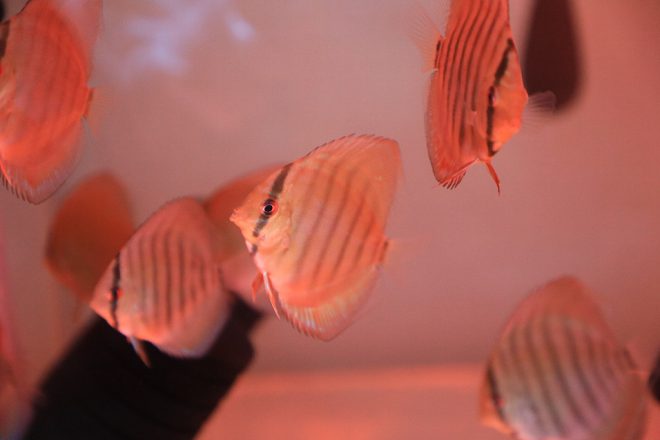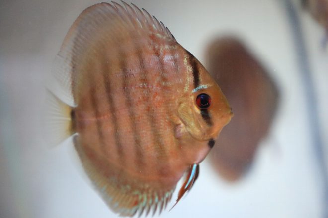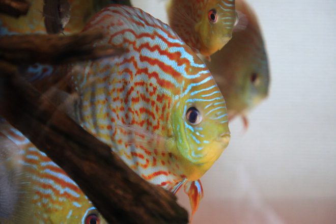 普段は群れをつくって生活するディスカス。繁殖期でない今、群れをつくっておさまっているのがわかります。