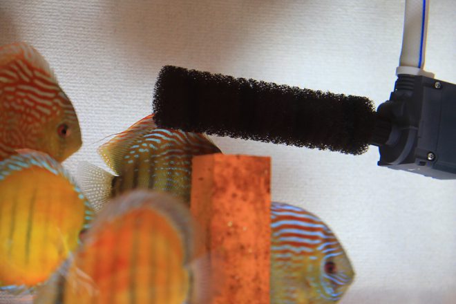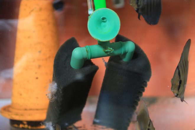 普通の観賞魚飼育より周辺器具が少なくて済むのも、ディスカス飼育の特徴です。水草や底砂がなくても、ライトがなくても大丈夫。ちなみに、フィルターは自作のスポンジフィルターを使用。「スポンジに付着するバクテリアが安定しているので、むしろこちらのほうがいいんです」。