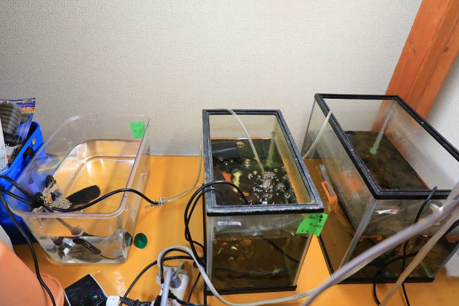 水槽の数は大小合わせて全部で15個。オールアクリル。45×45×60㎝がディスカスサイズの定番なのだそう。飼い始めたころから使っている水槽もたくさんあります。実家の東京から大学のある山口へ、そして大阪へきて2回の引っ越し。よくぞディスカス愛を貫いてきたものだと、感心せざるを得ません。「段取りさえ踏まえれば、水槽の引っ越しなんて家具や生活用品と同じですよ」と簡単に言うけど(笑)