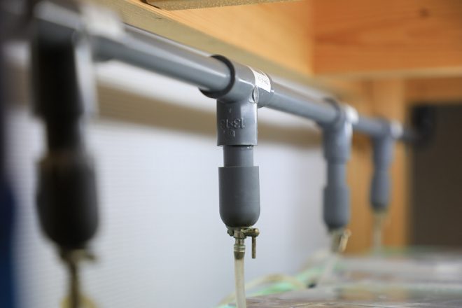 自作のオーバーフローの装置。ひとつ下の水槽で、温度を一定にしたろ過済みの水をつくって、4本のパイプで上の水槽に供給する仕組みです。オーバーフローというと海水魚のイメージが強いですが、「オーバーフロー水槽のほうが全体の水量が多いので、水質と水温が安定するのでいいんです」。