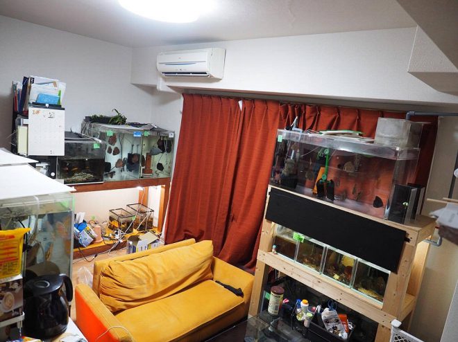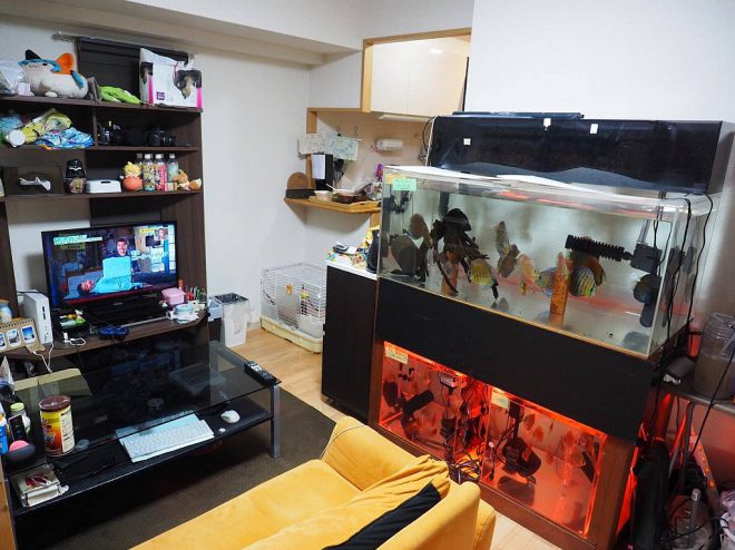 夏も冬もエアコンはフル回転。設定は常に25~26度。「8月は3万円近く電気代がかかりました(笑)」。もはやディスカス中心の生活。オタクはこのくらいの覚悟がないと(笑)