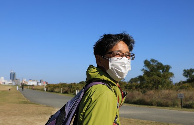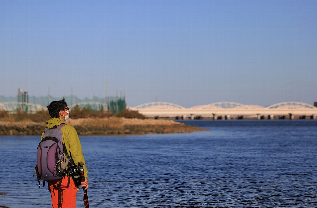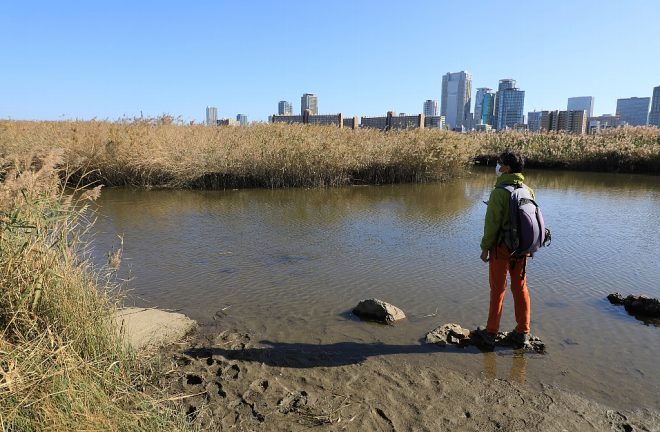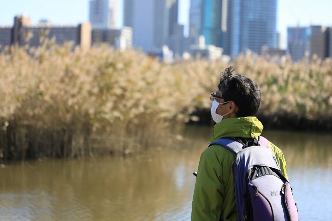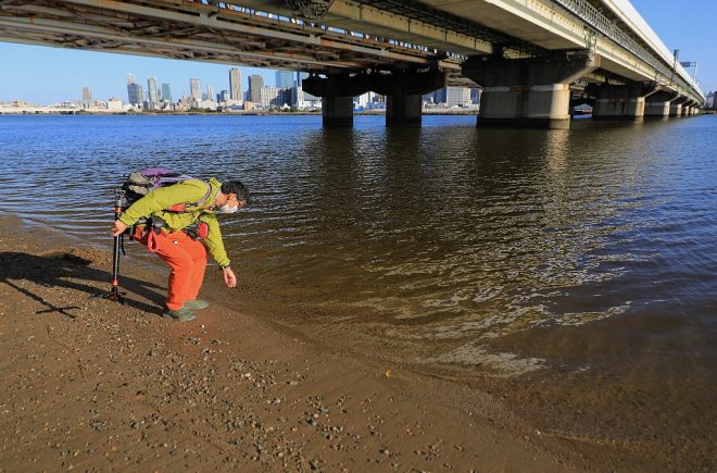 快晴の淀川。といっても上流ではなく、淡水と海水が入り交じった汽水域。午後1時に最寄り駅で待ち合わせしたにもかかわらず、すでにひと仕事してきたような出で立ちと、どこかスッキリしたような顔。はは~ん、さては取材の前に自分なりに自然観察を楽しんできましたね(笑)。この人、本当に自然が好きなのだなと実感させられた瞬間でもありました。