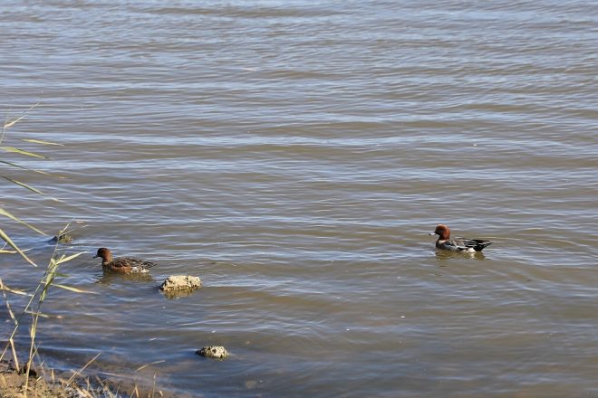 こんな野鳥もいました。くちばしが灰色で先が黒いつがい(頭が剥げているのがオス)や、額からくちばしにかけて白いヒドリガモが渡ってきています。理由は定かではありませんが、「ヒドリガモは年を追うごと増えてきています」。