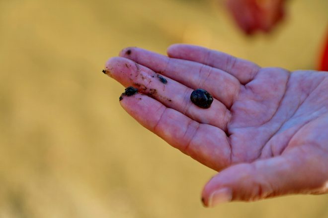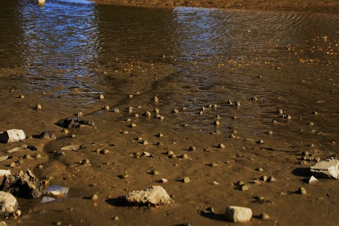 あちこちにある黒い団子状のものは一体?「シジミ団子です」。え?シジミシューカンなら聞いたことがありますが(笑)。「実は淀川でもたくさんシジミが採れるんです。おそらくシジミ漁の関係者がシジミのエサを団子状にして蒔いているのだと思います」。ということはシジミの仕掛け?聞くところによると、場所は明かせませんがシジミがたくさん採れるスポットはほかにもあるのだそうです。淀川でシジミが採れるなんてまたまたビックリでした。