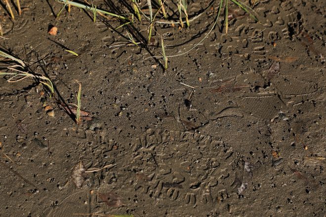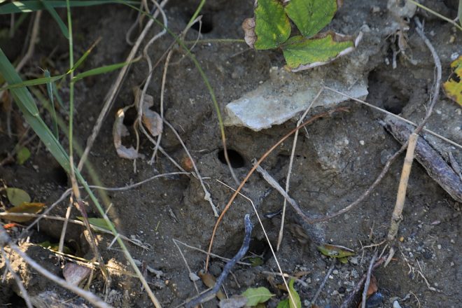 足元を見ると丸い穴がそこかしこに。これぞクロベンケイガニの巣穴。てっきりモグラかザリガニの巣かと思いました(笑)。世の中には、言われてみないとまったく気付かない生きものがたくさんいます。