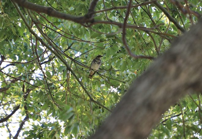 「木の上にツグミがいますよ」。ああ、これってツグミっていう名前なのですね。ツグミはシベリアで繁殖して渡ってきます。こんな生い茂った木にも普段から注目していれば、色々な鳥類との遭遇もあるんです。