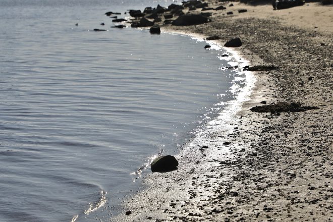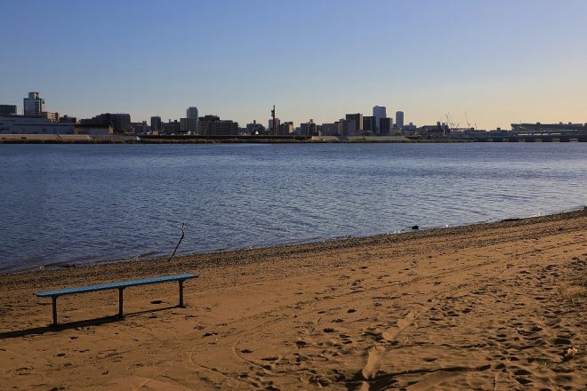 向こう側に回ってみると砂浜みたいになっています。この一角だけは、川とは思えない景色が広がっていました。ベンチがあるのもフシギ(笑)