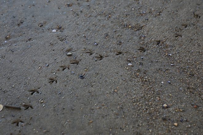 こんなところに着目するのも楽しい自然観察。山下さんによると、コザキの足跡ではないかと。ただ、くねくね曲がった歩き方をするのが特徴のシロチドリの足跡かもしれません。まるで探偵(笑)。あれこれと考察しながら歩くのも、自然観察の楽しみのひとつです。