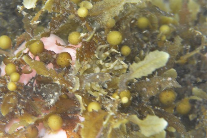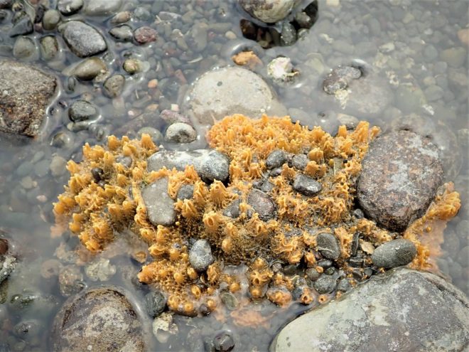 切り立つように礫浜で見つかるダイダイイソカイメン。こんなの今まで見たことない(笑)
