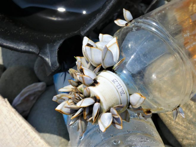 おそらく人間が捨てたであろうペットボトルに付着したフジツボのなかま・エボシガイ。