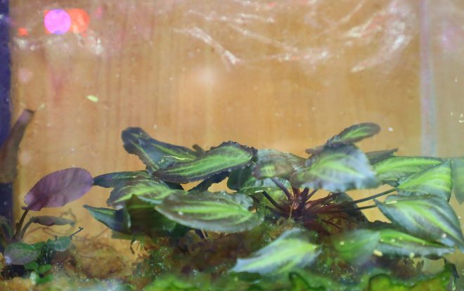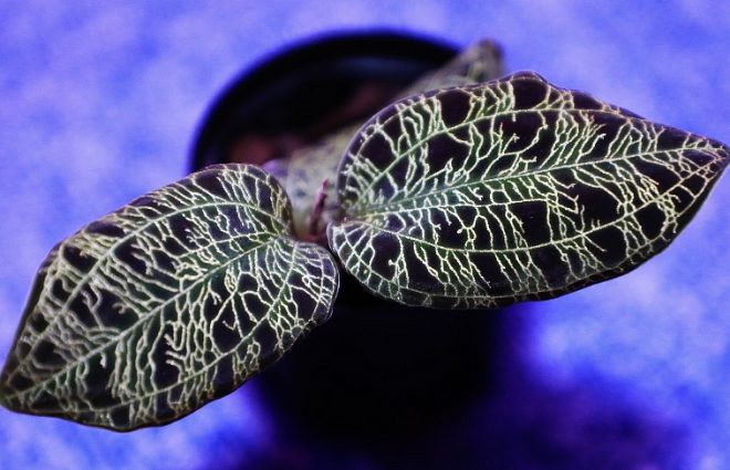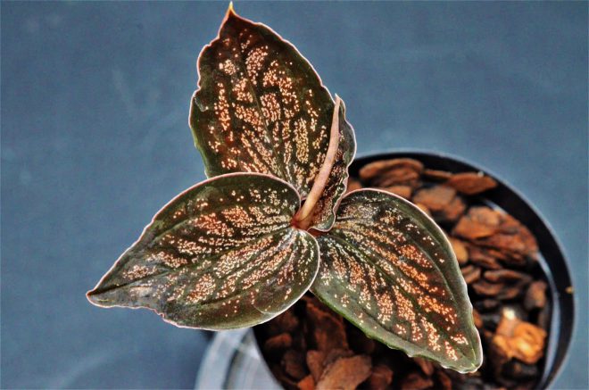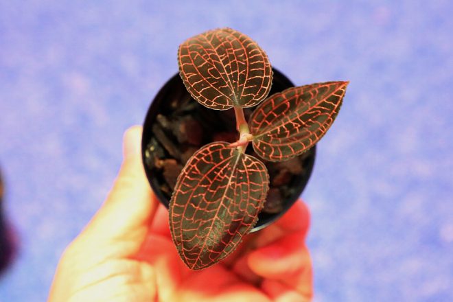 丸く広い葉に赤いラメの葉脈が入るアネクトキルス・ブレビラブリス。育成も比較的簡単で、よく増えるそうです。