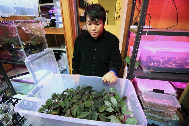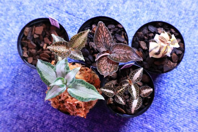原産国はインドネシアなどの東南アジアに集中していますが、現地で採取されたジュエルの輸入はワシントン条約により一切禁止。絶滅危惧種に指定されているらしく、これは意外でした。ただし培養株の状態での国際取引ならOKですが、それでも市販はほとんどされていません。ということは、太田垣さんのように多くの種類の培養株を所有している人は極めて少ないというわけです。知名度も需要もこれから。ないといわれれば余計に欲しくなる。それほど希少なものだけに、マニア心をさらにくすぐられる植物なのかも知れません。