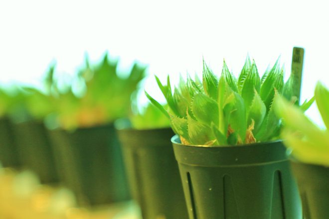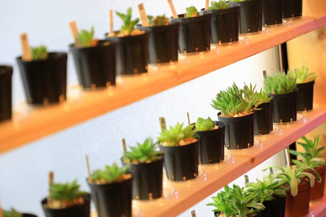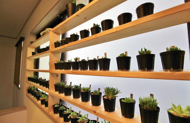 ファクトリー前の廊下には多肉植物のコーナーも。日当たりもよく、中には窓のほうに向いてしまっているわがままなヤツもいたりなんかします(笑)