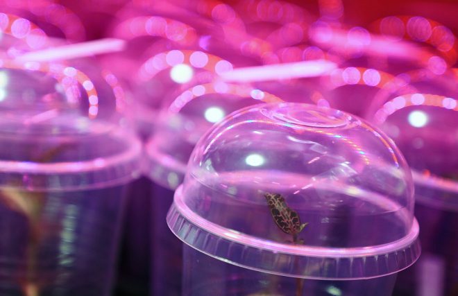 ジュエルオーキッドとは、日本語でいえば「宝石ラン」。ランはランでも洋ランの部類に入ります。通常のランと違って、花そのものよりも葉の模様を楽しむというのがこの趣味の楽しみ方なのだとか。花は目立たないくらい小さく、タネも細かくてラン菌のあるところにタネが着床しないと育たないため、株分けで増やすのが一般的です。