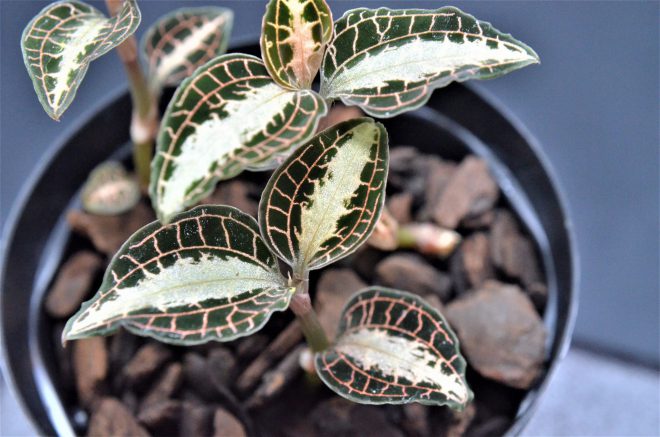 赤い葉脈が美しいベトナム産のグッディエラ。用土は程よく通気性のいいものが安定して育てられるそうで、太田垣さんの場合は洋ラン用の発酵バークや水ゴケあるいは松の木の樹皮を砕いて加工したバークチップなどを使っています。