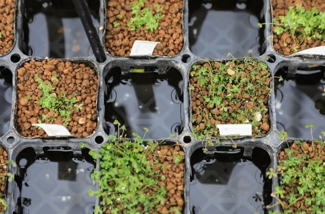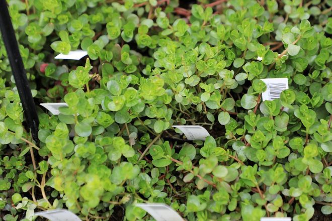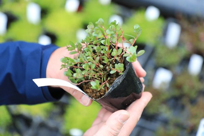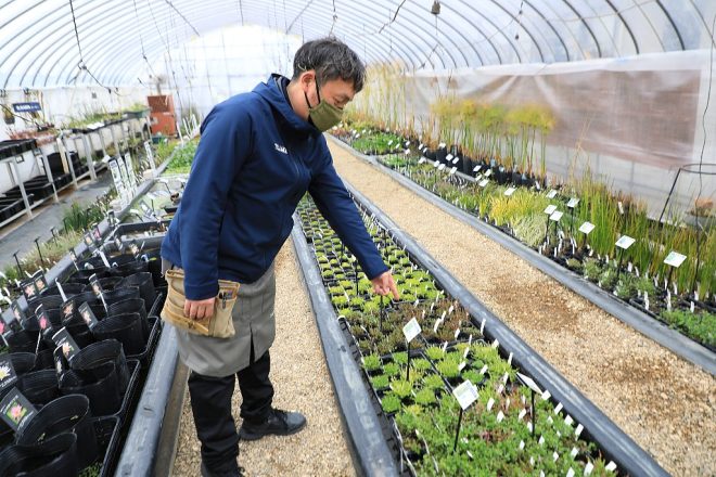 ん?前からこんなに細かく分類してあったっけ?足元を見ると、ポット苗の状態で整然と並んでいます。「そうなんですよ。お客様のニーズに応えるために、販売しているんです。苗だと手軽に扱えるとあって、お客様にも喜んでいただいていきます。いくらコンパクトな苗でも、品質は折り紙つき。何よりうちの植物には、生産部の魂がこもってますから(笑)」。