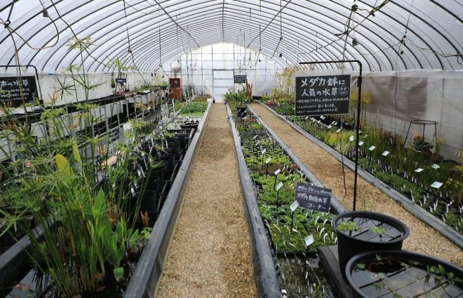 ここは2年前にも訪れた場所。広大なビニールハウスの中には、地元の生産現場で栽培されたさまざまな水生植物が成育中。休みの日になると、ここは多くの園芸ファンやメダカファンで埋めつくされています。しかも1時間や2時間の滞在はザラで、まる一日品定めをしている園芸ファンも少なくありません。