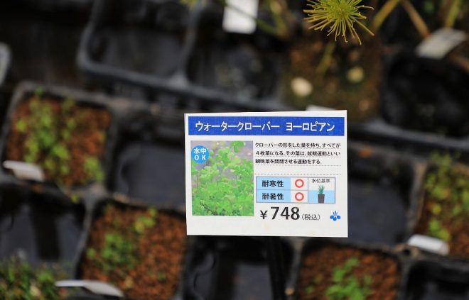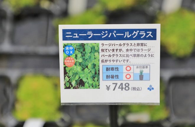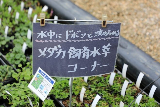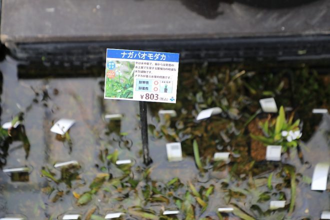 こんなわかりやすい表示も。これなら、目的に応じた水草を探すことができます。しかも、メダカとは別にアクアリウムという新コーナーが強調されていたことに、ついニヤニヤしてしまうのはキワメテだけでしょうか(笑)。