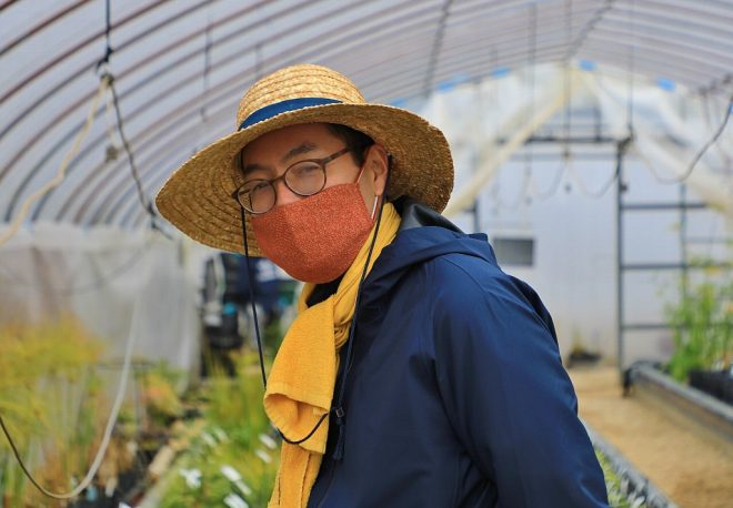 と話してくれたのは、この人。一度でも杜若園芸を訪れたことがあるなら、きっとこの顔にピンとくるはず(笑)。そうです、今や動画配信ですっかりおなじみになった店長の鈴木久利さんです。麦わら帽子に幸せの黄色い首タオルがトレードマーク(笑)。2年経った今でも健在です。というより、動画もファンもさらに増殖中で、販促に大きく貢献していることはいうまでもありません。