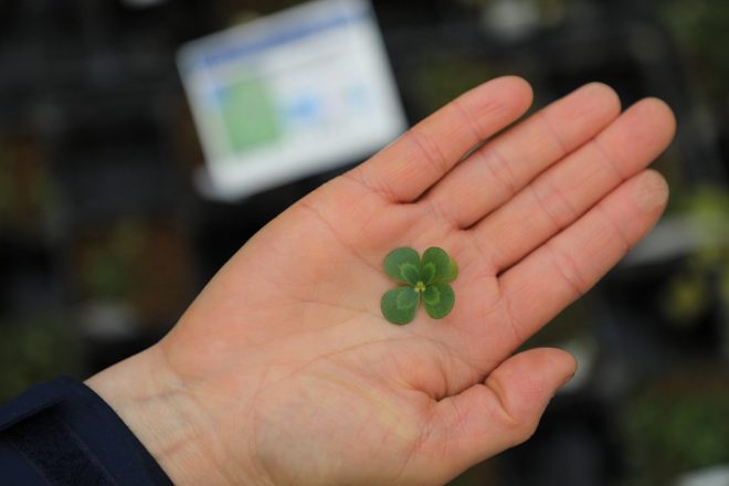 ウォータークローバー ヨーロピアンは、すべてが四つ葉なんです。これも花田さんの女性ならではの視点。公園などで必死になって探さなくても大丈夫です(笑)。