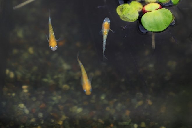 花田さんの推しはビオトープ。メダカの泳ぐスペースを確保しつつ、隠れ家のためにナガバオモダカやミニシペラス、浮草を添え溶岩石や流木でフィニッシュ。日本フラワーデザイナー1級の有資格者の花田さん、芸は身を助けています。