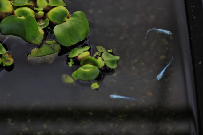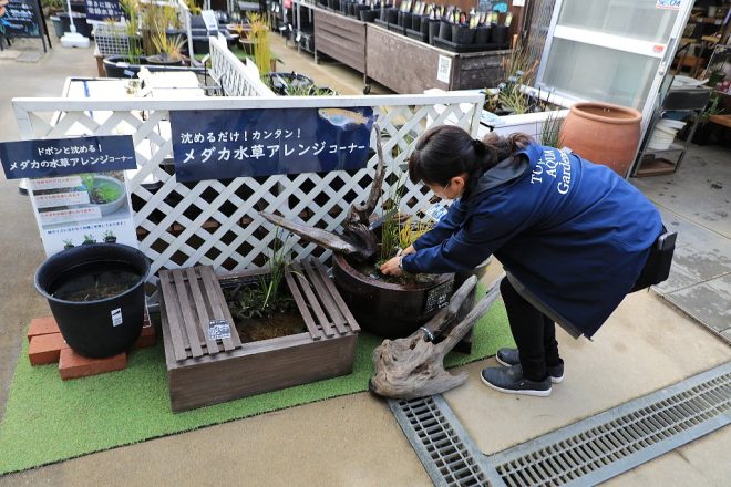 王道ともいうべき、メダカ飼育に適した水草コーナー。水中にドボンと沈められるのだそう。この表現、シンプルかつわかりやすいですね。