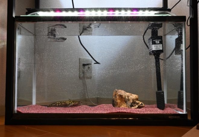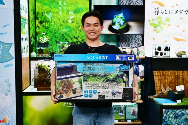 この水槽、実は今年5月に開催された「ペット王国2023」でゲットしました。KOTOBUKIブースで行われていたガラポン抽選会に何気なく参加したところ、何と1等賞。見事に水槽セットを引き当てたのでした。