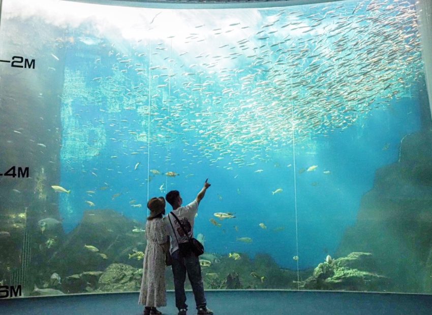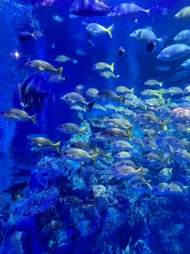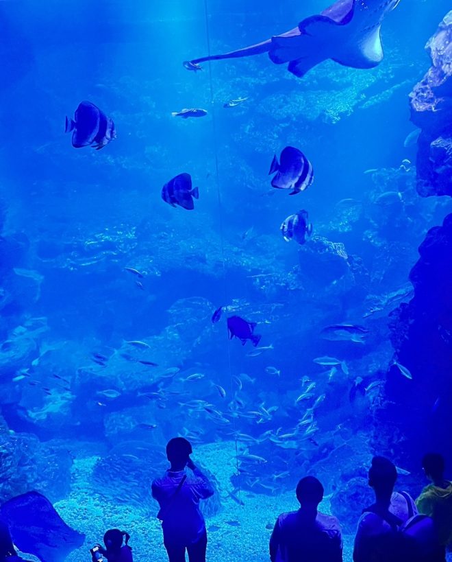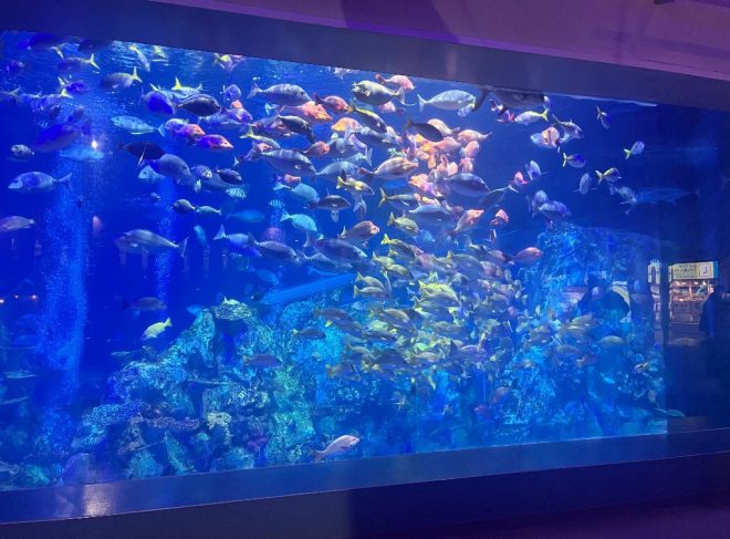 一眼だとハッキリ&クッキリ。平日だったので人も少なく、「彼女が特に好きなシュモクザメやジンベイザメも間近に見れて、大いにテンションが上がりました」。