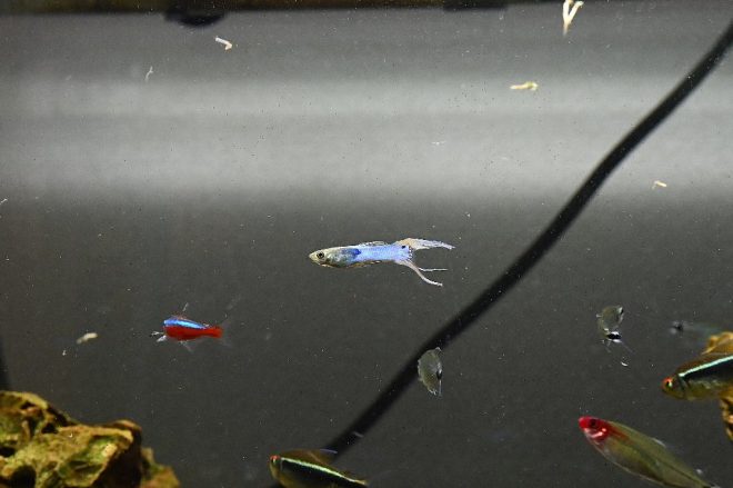 このほか、オトシンクルスやミクロラスボラハナビ、そして特徴的な尾びれを持つソードテールグッピーも。