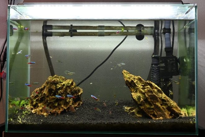しかもフィルターはハンドメイドの上部式。よく見ると、ろ材が適宜投入されています。