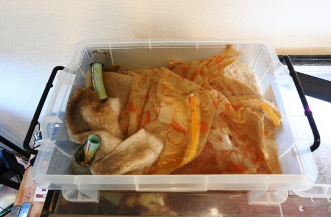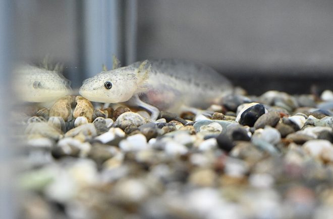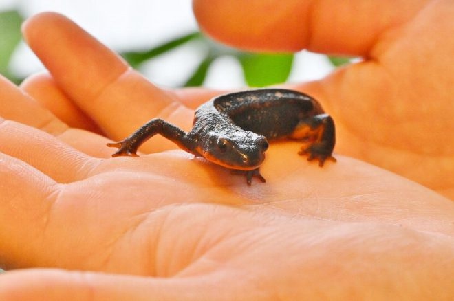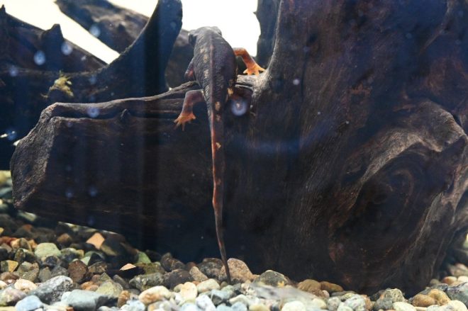 手にとって出して現場検証。赤ちゃんみたいな手がチャームポイントなんだそう。「お前、大きくなったなぁ」とポツリ。ほかにも、背中が黒いのが特徴のアカハライモリもいますが、とおま君自らが清流で採取したもの。残念ながらこの時は姿を現してくれませんでした。