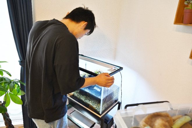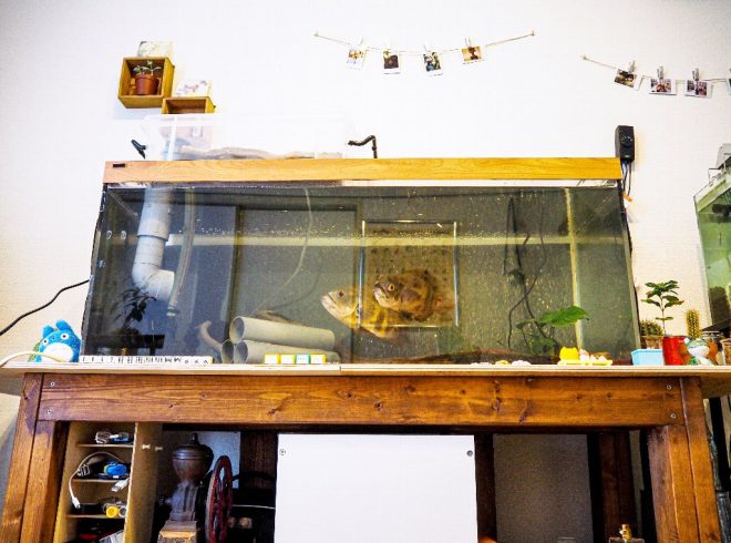 アクアが好きで釣りも好き。魚は子どものころから好きでした。「どうしても魚と一緒に暮らしたくて」、一人暮らしを始めたのと同時に立ち上げたのがこの水槽。まさにザ・熱帯魚水槽。普段は照明を使うことはほぼありません。「一時水草を育てていた時は使っていましたが、自分はやっぱり魚が主体なので」。