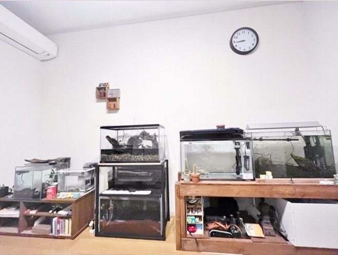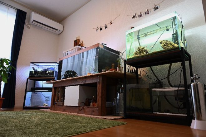 この水槽をゲットするまでは、こんな感じ。比較的コンパクトな水槽ばかりが5本。もしかしたら60㎝水槽が3つになったことで、アクア熱に火がついたのかも知れません。「何と言ったらいいのかわかりませんが、これで歯止めが効かなくなってしまったんです(笑)」。あかんでしょ、消防士が熱くなっちゃ(笑)。