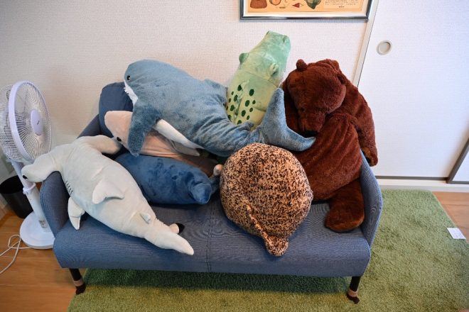 ソファには戦利品の数々。こんなサイズのぬいぐるみを抱えて持って帰ってこれること自体、若さを感じます。