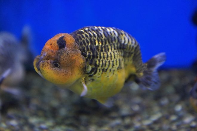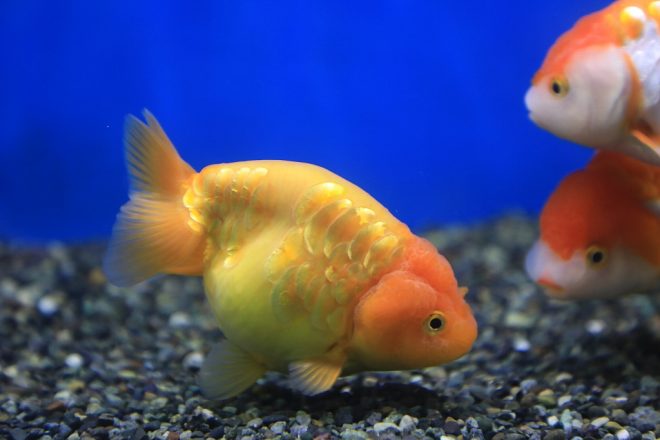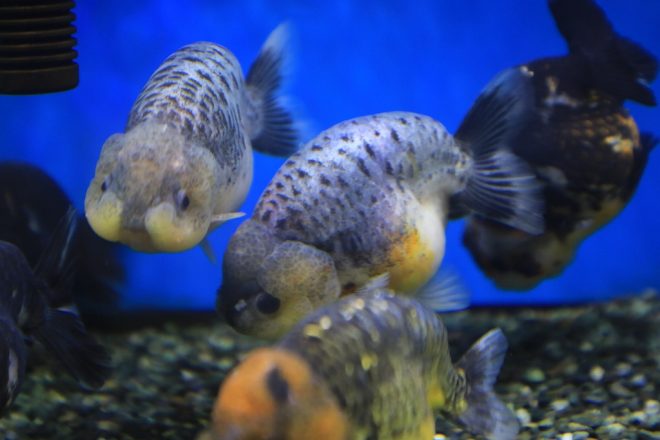 龍鱗蘭寿。ドラゴンスケールらんちゅうとも呼ばれ、通常のらんちゅうよりうろこが大きいのが特徴。うろこが一番大きいものだと価格は45,000円も。こうした金魚もアジアアロワナ同様海外直輸入、もしくは国内養魚場での直接買い付けが主です。