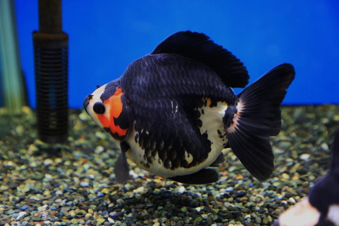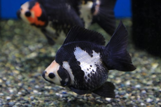 水墨蘭寿。またの名をパンダらんちゅう。と聞けば、ああアレのことかと思い当たる人も多いはず。白と黒の色が可愛くて人気です。