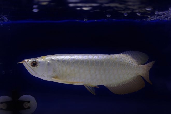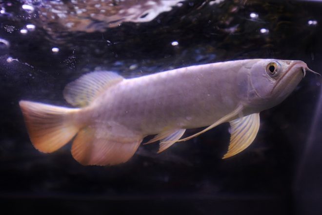 過背金龍「レディアンスゴールデン」。金色のキラキラのうろこが背ビレのところまで乗っています。ちなみにアジアアロワナは、【品種+色】を名称とすることが一般的で、店頭では色を省略してアルファベット表記されています。