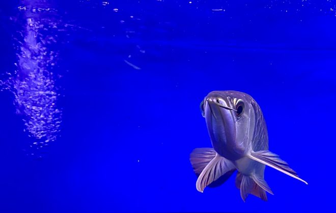 取材のこの日は、ちょうど前日にイキのいいアジアアロワナが海外から入荷した直後でした。早速水槽を見てみると、まず目に飛び込んできたのが、高背金龍といわれる品種で、多くの個体が遊泳中。こんなにたくさん仕入れても大丈夫?なんて余計な心配をしていたら「仕入れても仕入れてもどんどん売れるんですよ(笑)。そもそも輸入直後が一番在庫が豊富ですから」とオーナーの佐野さん。今年は新型コロナの影響も懸念され現地買い付けはできませんでしたが、これまでの実績もあり輸入が途切れることはありませんでした。加えて、おうち時間が長引いたことも功を奏したのか、むしろ例年以上に販売できたそうです。