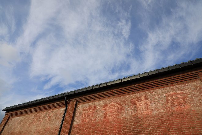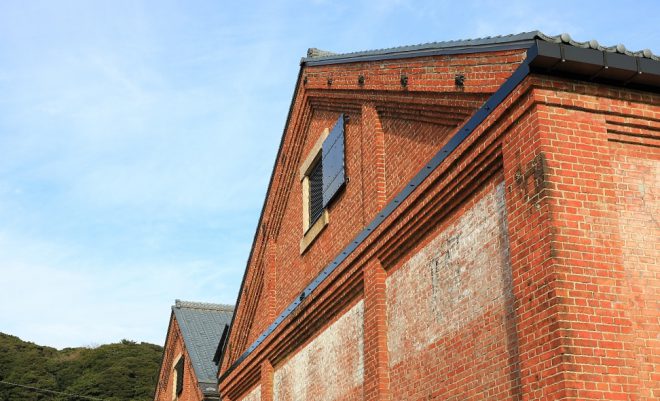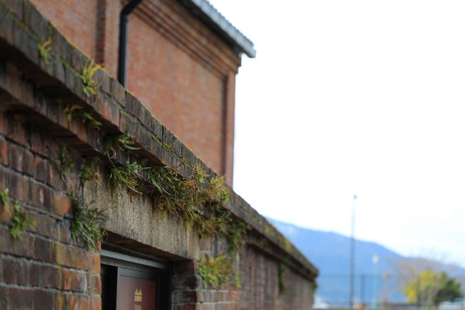 敦賀赤レンガ倉庫の煉瓦塀。風化したレンガの色、隙間に生え始めた植物などが、流れていく時間を物語っています。賑わっていた在りし日の敦賀港の倉庫街を行き交う人たちの息遣いが感じられるような風景もきちんと残されています。