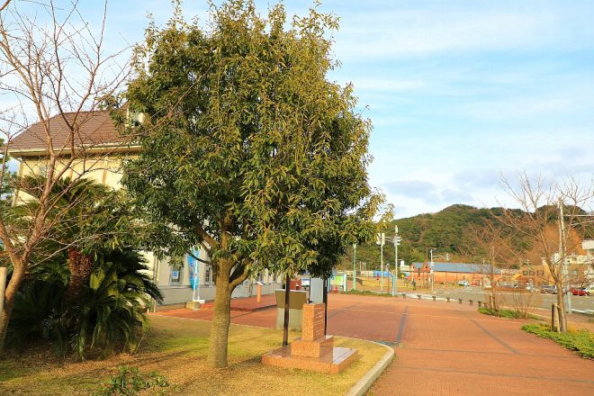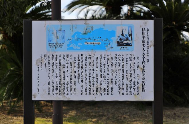 駅舎の少し手前にある桜と樫の木。看板を読んでみると、第二次世界大戦時にリトアニアと日本の架け橋となった当時のリトアニア領事代理杉原千畝さんの奥様(杉原幸子さん)がこの地を訪れた記念に植えられたものです。