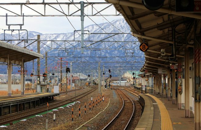 特急では約1時間。直通の新快速でも1時間半。北陸といえど、関西からだと敦賀は遠いようで意外と近いことがわかります。JR敦賀駅ホームに降り立つと遠くに雪を被った山々が見え、旅情はたっぷりです。