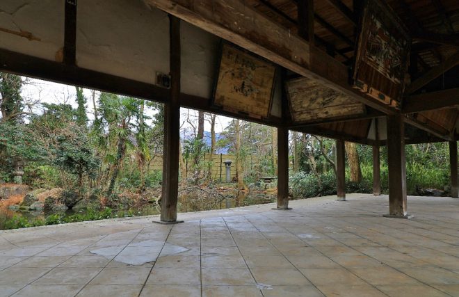 芭蕉の句碑のさらに奥に絵馬堂があり、額縁庭園のような景色が広がっています。芭蕉もこの景色を見たことでしょう。