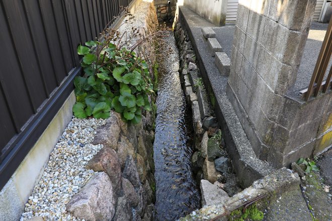 比較的平坦な場所から涌き出た水の量は気比神宮より多く、側溝をたっぷりと満たしています。