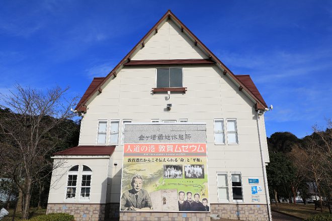 公園内の小さな建物・敦賀ムゼウム。1940年から約1年間、杉原氏によって助けられたユダヤ人難民約6,000人がシベリア鉄道経由でウラジオストクから船によって敦賀港に上陸。そうした戦争によって暗い影を落とした歴史的資料が、数多く残されています。
