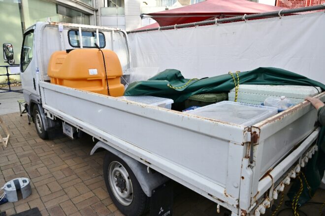 ここが移動水族館「うみばこファーム」の特設開場。関西テレビ社屋の敷地内に設置され、フェスと往復する来場者も多くアクセス良好の立地。なぜか2トントラックが横付け。この理由はまたのちほど。