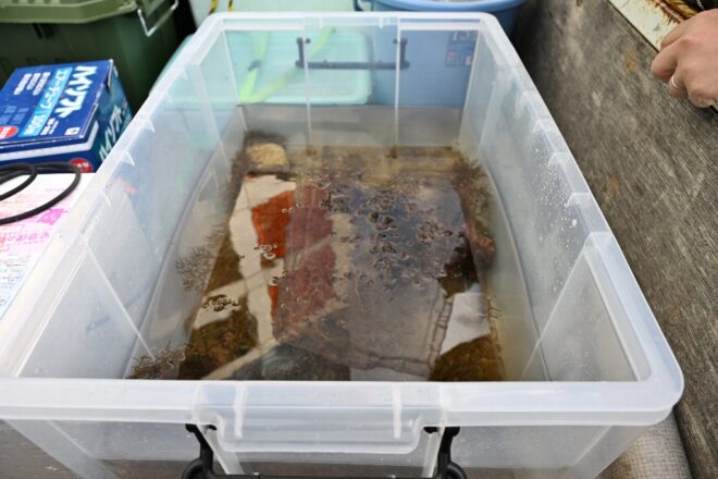 もうひとつの人気アトラクションが「磯の生き物すくい」。クサフグやギンポ、タケノコメバル、ドロメ、スジエビ、カサゴの幼魚などを、ひしゃくと丸底鉢ネットでつくったハンドメイドツールですくうというもの。もちろん製作者はさめっち。