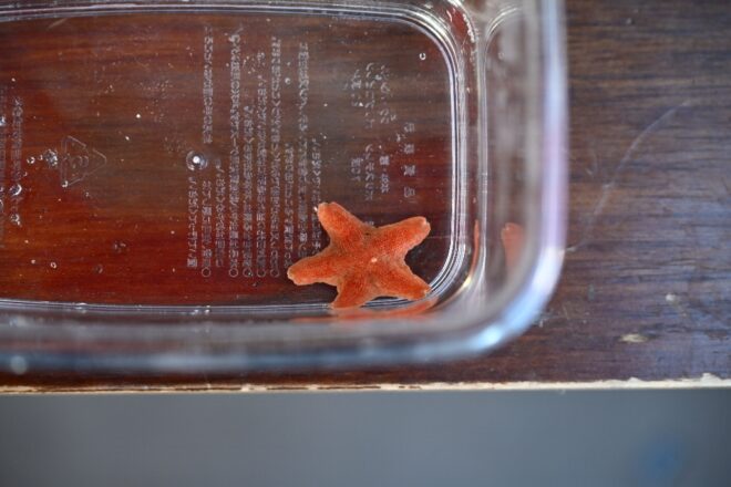 ヒトデが大好きという小学生女子。「一緒に散歩がしたい」。ええええ!?そんなリクエストにもNOを言わないのが、さめっち。プラケースに入れて、しばしチビイトマキヒトデとイベント会場内をゆるりとお散歩。両親も大喜びでした。この体験は生涯忘れることはないでしょう。将来のさめっち誕生かも。