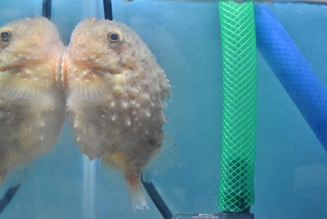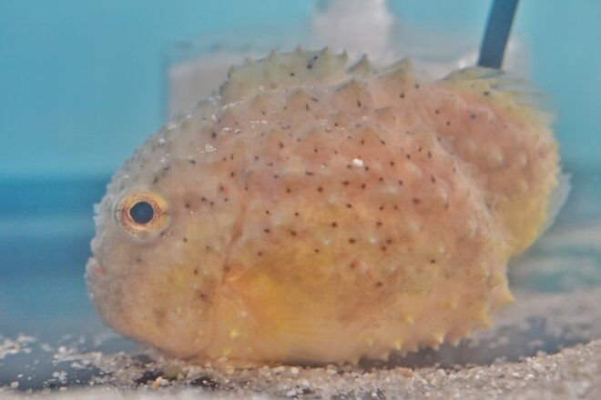 「可愛いやん、これ~。また明日も来てみたいわ~」。きなはれきなはれ。ご近所からお越しのお母さんが絶賛していたのがコンペイトウ。その名の通り、お菓子の金平糖に似ていることでこの名がついた魚で、タンゴウオ科の深海魚。できるだけ珍しい魚をチョイスしていたという河村さん、してやったり。