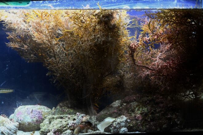 ここから先は、アクアっぽい展示が並びます。この水槽では日本海の漁港を再現。魚たちの排泄物を吸って自らの栄養に変えるホンダワラを中心にした、いわばアクアポニックスの海版。